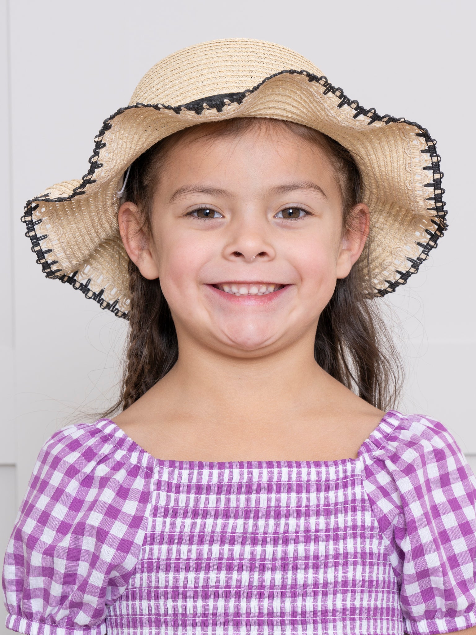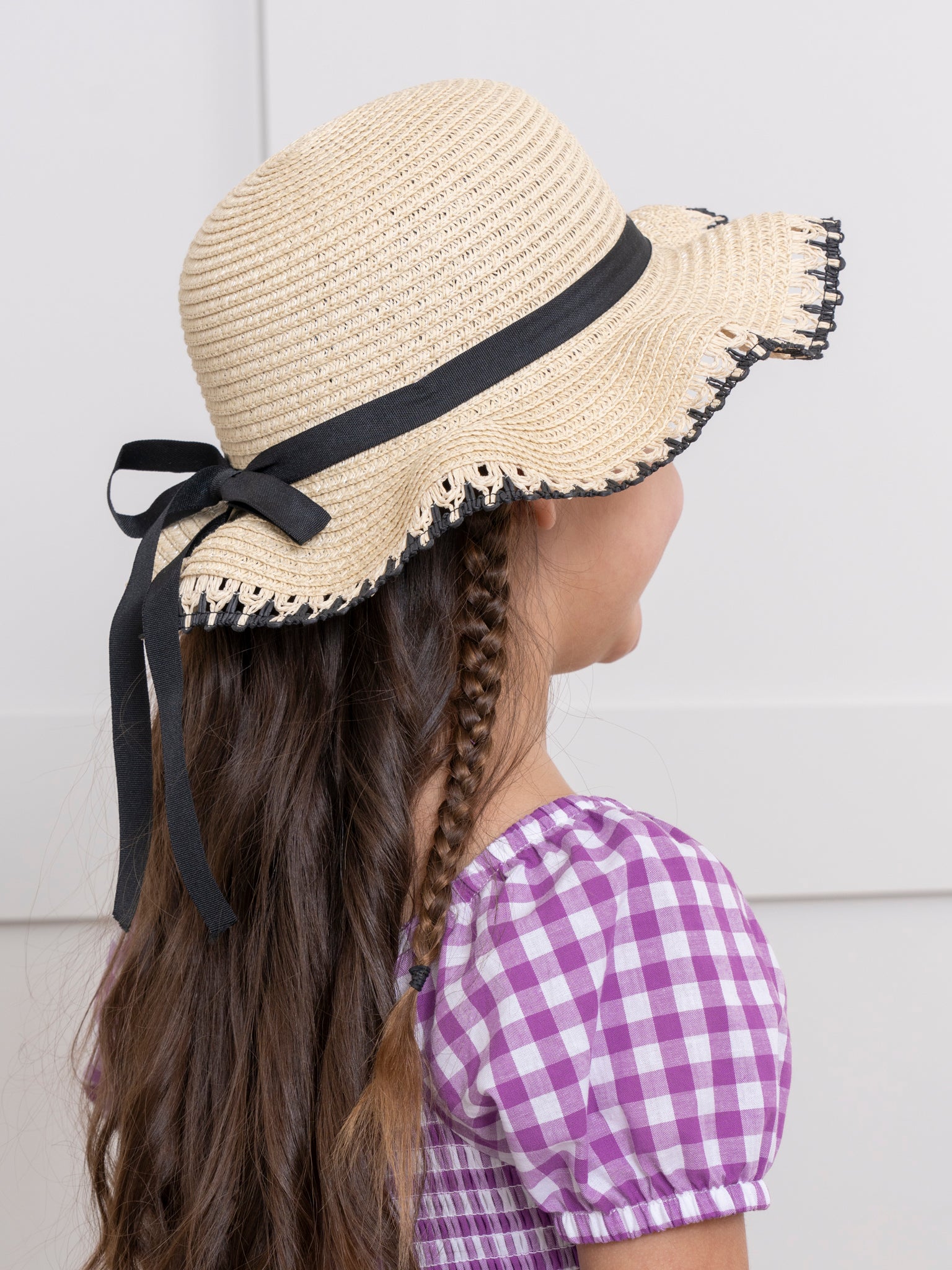 Get ready to have your little one look stylish and stay protected from the sun with our Beige Ruffle Sun Hat by Marie Nicole Clothing! With its adorable ruffle edges, black trim, and ribbon bow, this girls' sun hat is both functional and fashionable. Plus, the elastic chin strap ensures a secure fit without sacrificing comfort. Perfect for any sunny day adventure!